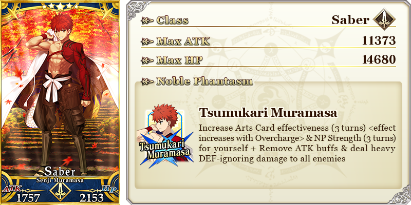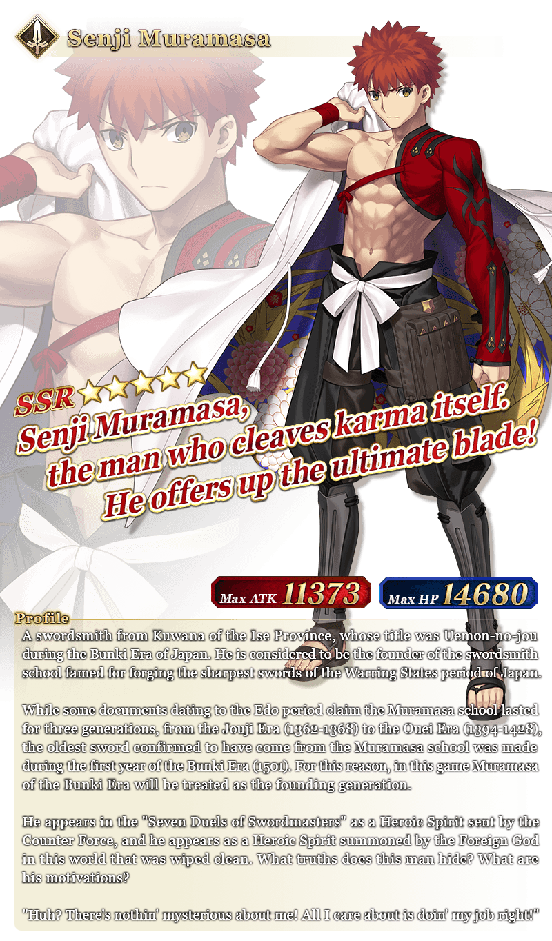 See "★5 (SSR) Senji Muramasa" in action on YouTube, where we're sharing an exclusive video of his Noble Phantasm!