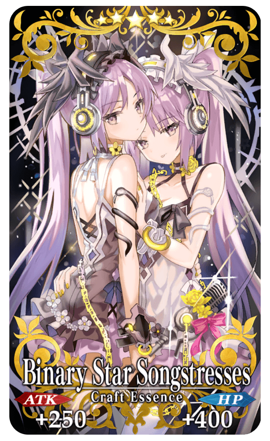 ★★★★★SSR Binary Star Songstresses ATK 250 (MAX: 1000) HP 400 (MAX: 1600) Skill Increase NP Gain by 10% & increase NP Strength by 10% & gain 3 C. Stars each turn for yourself + Increase your ATK Strength by 100% in "Revival: SABER WARS 2 - To the Beginning of Space - Lite" + Increase amount of Altrium per drop by 1 [Event Only]