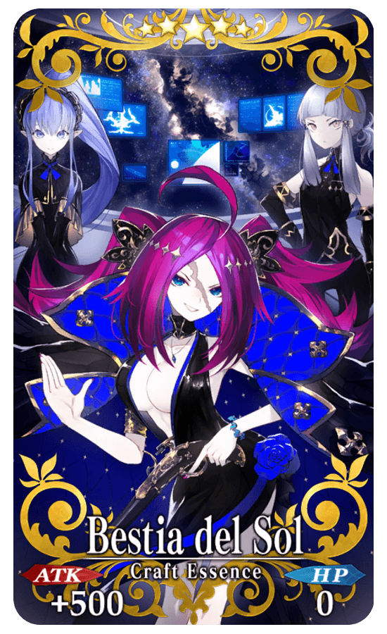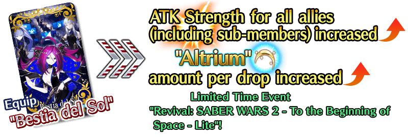 The Event Limited Craft Essence "★5 (SSR) Bestia del Sol", available through Event Item Exchange, will grant an ATK bonus for all allies (including sub-members) within event quests in the Limited Time Event "Revival: SABER WARS 2 - To the Beginning of Space - Lite".