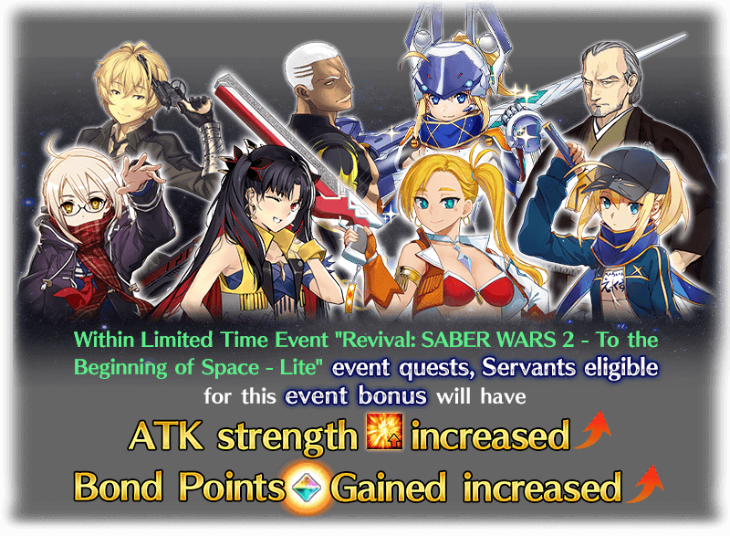 During the event period, the Servants listed below will receive bonuses to their ATK Strength and Bond Points Acquired within event quests.