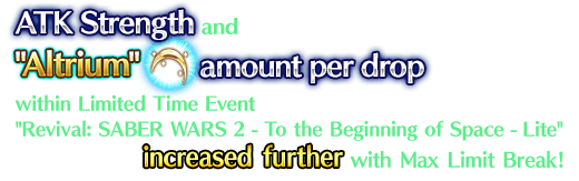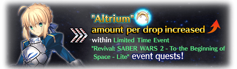 For the duration of the event period, "★5 (SSR) Altria Pendragon (Saber)" will receive a bonus to the amount per drop of the event item "Altrium".