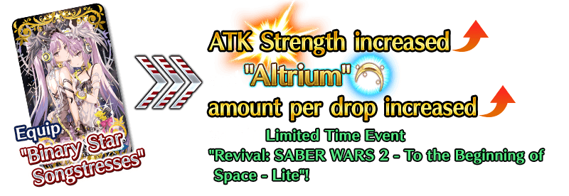 Equip the Event Limited Craft Essence "★5 (SSR) Binary Star Songstresses", available through Event Item Exchange, to gain an ATK bonus for the equipped Servant within event quests in the Limited Time Event "Revival: SABER WARS 2 - To the Beginning of Space - Lite".
