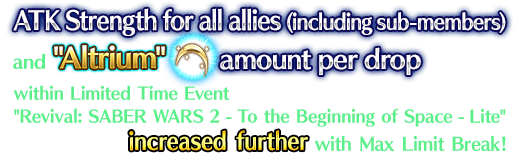 ★★★★★SSR Bestia del Sol ATK 500 (MAX: 2000) HP 0 Skill Increase Quick Card effectiveness by 10% & increase Buster Card effectiveness by 10% & increase Critical Strength by 10% for yourself + Increase ATK Strength by 50% for all allies (including sub-members) in "Revival: SABER WARS 2 - To the Beginning of Space - Lite" + Increase amount of Altrium per drop by 1 [Event Only]