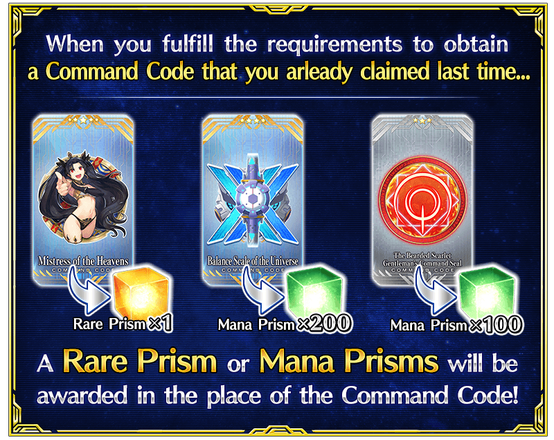 - If you already claimed "Command Codes" in the original event, the equivalent reward for completing each specific quest will be a Rare Prism or Mana Prisms.