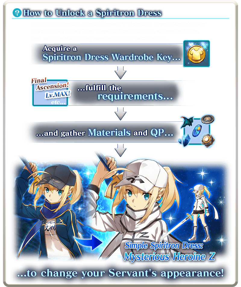* Upon unlocking a Spiritron Dress, the Servant's battle sprite and icons will automatically be changed. You can revert back to the original appearance or change to a different Ascension level from the Servant Details screen.