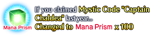 - If you acquired the Mystic Code "Captain Chaldea" in the original event, the equivalent reward will be "Mana Prisms".