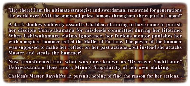 When Ushiwakamaru starts acting strange, Master chases after her and Rayshifts to a Singularity, beginning a journey that covers multiple Singularities to uncover the truth!
