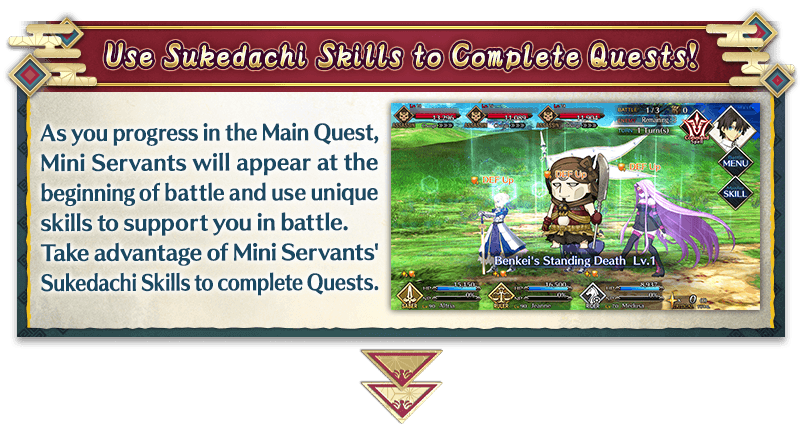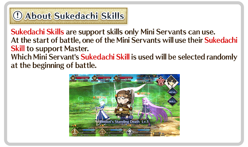 Mini Servants will use Sukedachi Skills to support you at the beginning of battles.