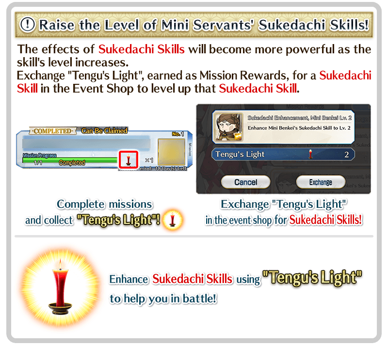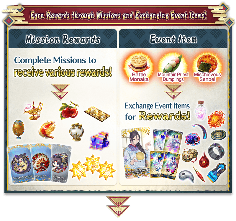 * Hero Crystal: Meteor Fou ALL ★4 (HP) and Hero Crystal: Corona Fou ALL ★4 (ATK) will become available for exchange as you progress in the portion of the event's Main Quest scheduled to be unlocked at 2023-01-24 PST (GMT -8). * "Battle Monaka", "Mountain Priest Dumplings", "Mischievous Senbei", and "Tengu's Light" will disappear at the end of the exchange period. * "Tengu's Light"can be exchanged for QP once the event period has ended.