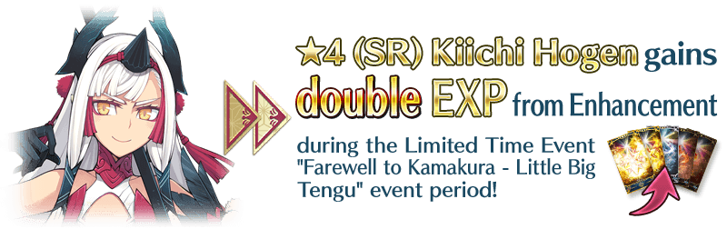 For the duration of the event period, "★4 (SR) Kiichi Hogen" will receive double EXP when performing Enhancement.