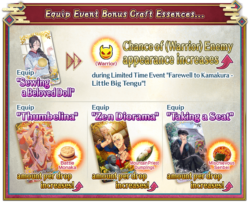 Plus, Servants equipped with the Limited Time Craft Essences "★5 (SSR) Thumbelina", "★4(SR) Zen Diorama", and "★3 (R) Taking a Seat", available through the ongoing Pickup Summon, will receive a bonus to the amount per drop of event items "Battle Monaka", "Mountain Priest Dumplings", and "Mischievous Senbei".