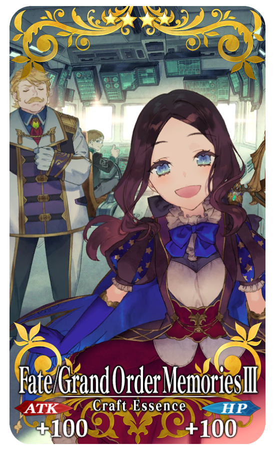 ★★★★SR Fate/Grand Order Memories III ATK 100 (MAX: 100) HP 100 (MAX: 100) Skill When a quest is completed, increase the amount of Mystic Code EXP gained by 50 |