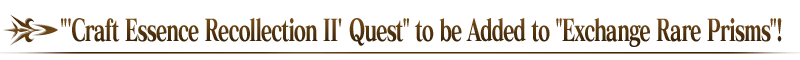 * "'Craft Essence Recollection II' Quest" will be permanently added to "Exchange Rare Prisms". There will be no time limit on exchange. * If you have previously cleared the quest, remaining stock will be displayed as "0" and you will not be able to exchange for it. * The Limited Craft Essence obtainable through the quest will be at maximum level. * Please note that the "'Craft Essence Recollection II' Quest" will be a battle only quest.