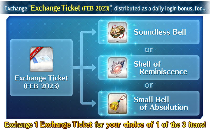 The "Exchange Ticket (FEB 2023)" distributed as a daily login bonus will be exchangeable for the following items.