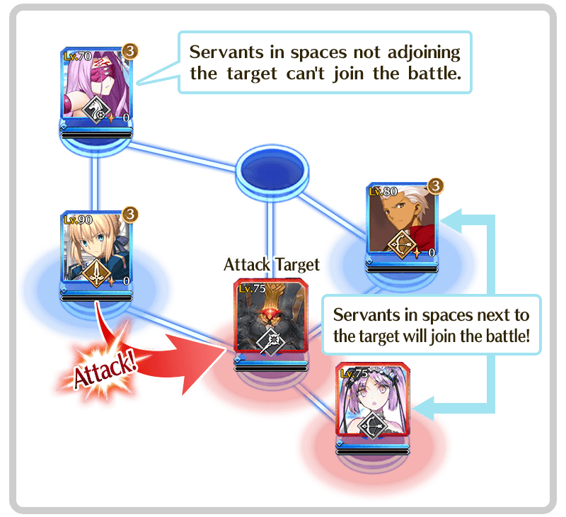 In addition, if there are any Servants in spaces next to the target of an attack, they will also join the battle.