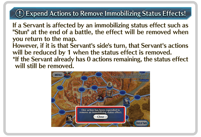 A Servant whose HP is reduced to 0 will retreat from that battle, but upon returning to the map a Break Point will be expended and their HP will be fully recovered. If a Servant's HP is reduced to 0 when they have no Break Points remaining, they will be removed from the map.
