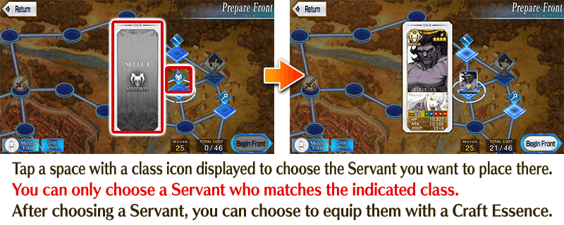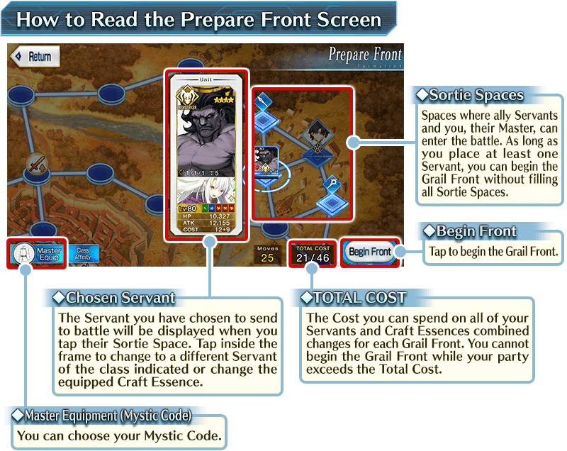 The first thing you'll do in each Grail Front is choose your Mystic Code and the Servants you want to send into battle on the “Prepare Front” screen. Each Grail Front has a predetermined "TOTAL COST". You cannot exceed the "TOTAL COST" when setting your Servants and Craft Essences. However, as long as you set at least once Servant to send into battle, you don't have to set Servants in every space available.