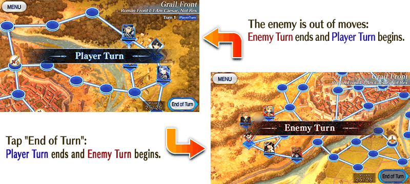 A set number of moves is granted at the beginning of each Player Turn and Enemy Turn. Moving the Master or Servants or attacking will expend moves. When you are out of moves or tap the "End of Turn" button on the bottom right side of the screen, the turn will end.