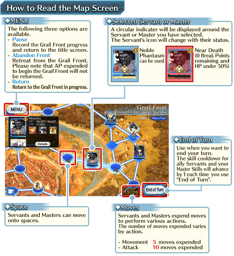 You can move both Master and Servants on the Grail Front map. While both can perform basically the same actions by expending moves, there are some differences between Servant and Master, including who they can attack and conditions for victory.