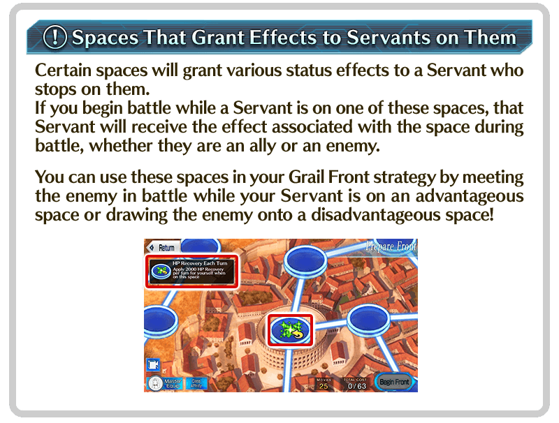 A Servant can expend 10 moves to attack an enemy Servant in a space next to them, upon which a battle will begin. When a number of turns equal to the number of attacking Servants has passed, or one side's Servants have all had their HP reduced to 0, you will return to the map.