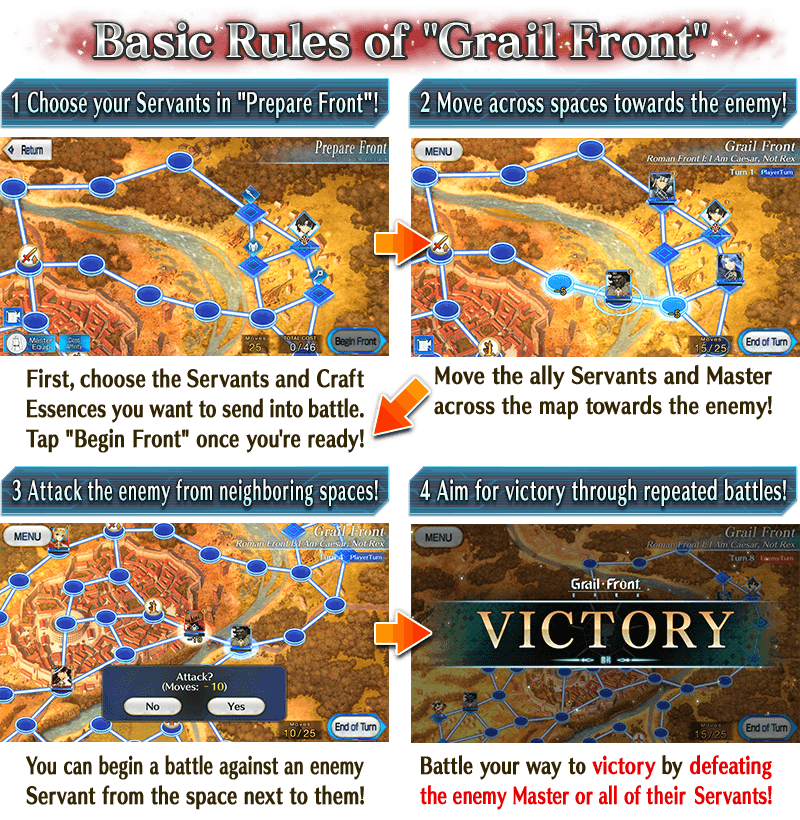 Alternate turns and defeat the enemy Master or defeat all enemy Servants to win the Grail Front.