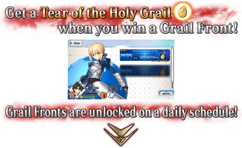 In each Grail Front, Masters and Servants divided into enemies and allies will battle multiple times on a special battlefield. Win a Grail Front to earn one Tear of the Holy Grail.