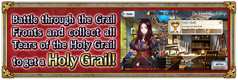 Within "Exchange Tears of the Holy Grail", you can exchange seven Tears of the Holy Grail for one Holy Grail. Collect Tears of the Holy Grail by winning Grail Fronts and get a Holy Grail!