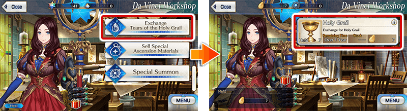 * Tears of the Holy Grail acquired through the Limited Time Event "Land of Shadows Battleground Blitz - A Cat, a Bunny, and a Holy Grail War" can also be used for Holy Grail exchange.