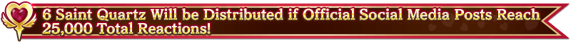 If you can help us get the Facebook and Twitter posts to a total of 25,000 Facebook Reactions/Shares and Twitter Likes/Retweets during the period below, we'll distribute 6 Saint Quartz to all Masters!