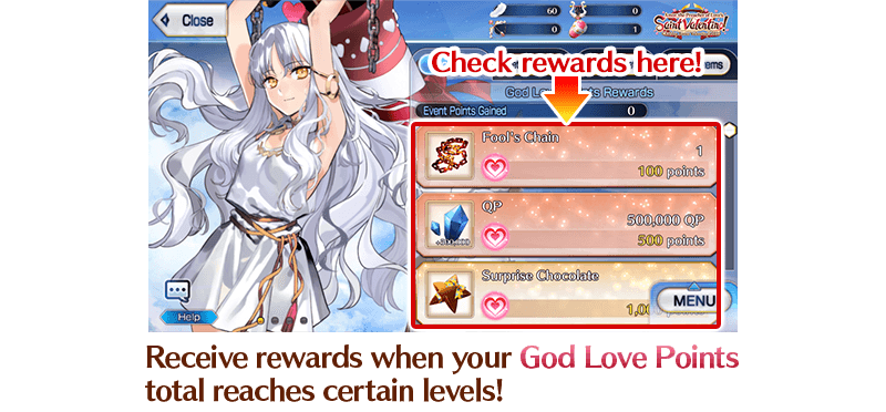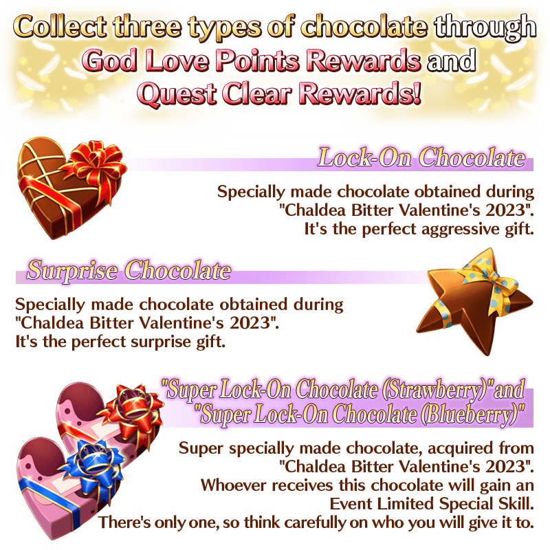 Challenge Event Quests to collect "God Love Points", get the event exchange items "Lock-On Chocolate" and "Surprise Chocolate", and receive Valentine's presents from your Servants!