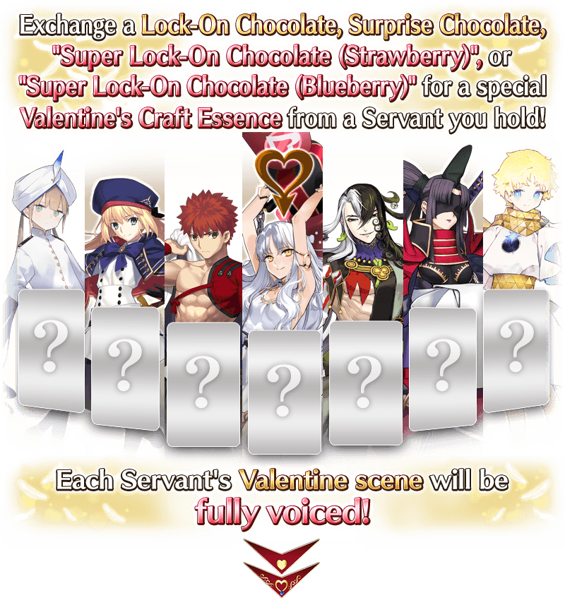 * Each Servant's Valentine scene and the Craft Essence available will be the same whether you use "Lock-On Chocolate" or "Surprise Chocolate".