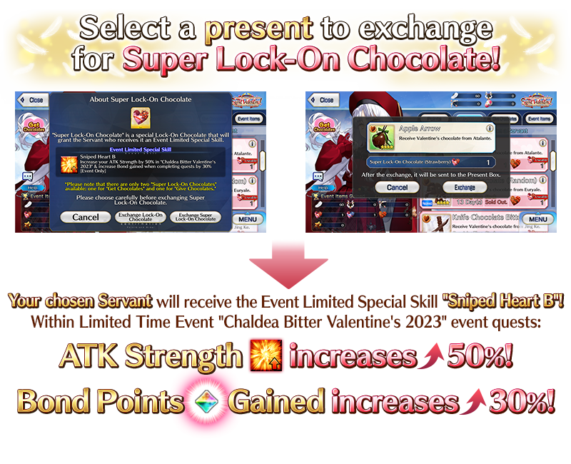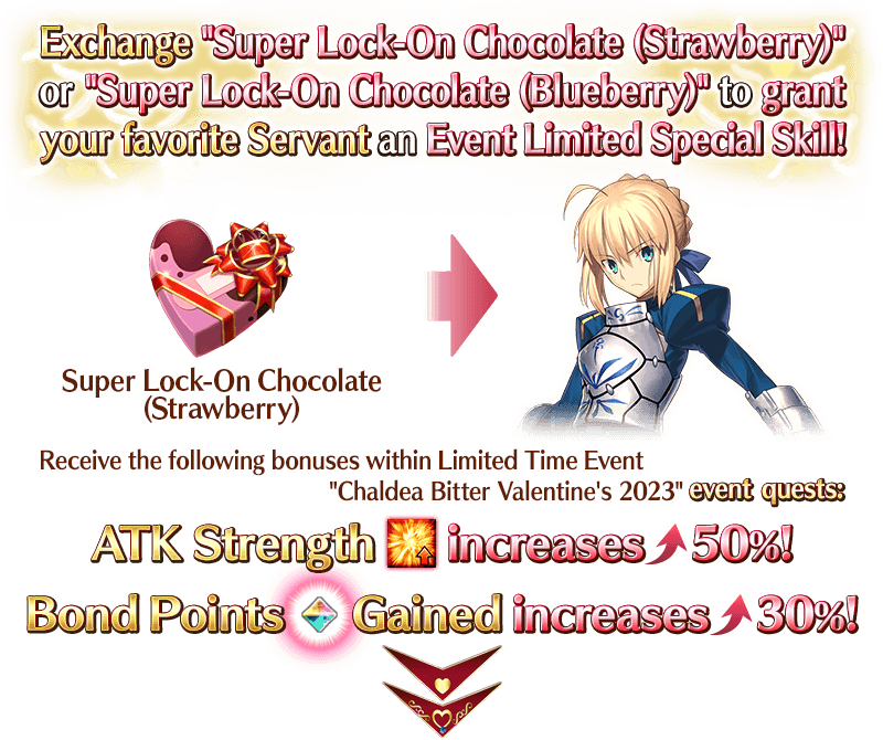 By exchanging "Super Lock-On Chocolate (Strawberry)" or "Super Lock-On Chocolate (Blueberry)" for a Valentine's gift (Craft Essence), an eligible Servant will gain the Event Limited Special Skill "Sniped Heart B" for the duration of this event.