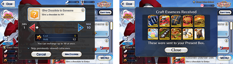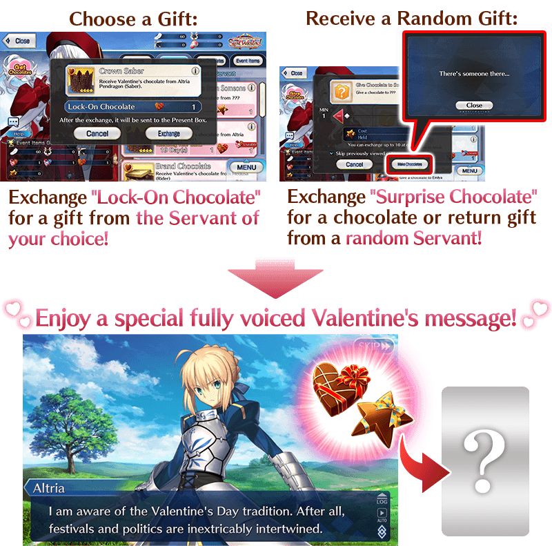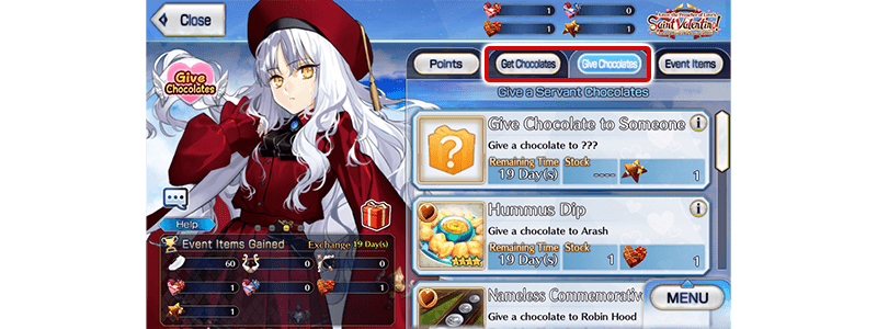 Receive Valentine's gifts from female Servants through "Get Chocolates" and male Servants through "Give Chocolates" within Event Item Exchange.