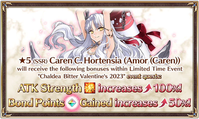 New Servant "★5 (SSR) Caren C. Hortensia (Amor (Caren))" will receive a 100% ATK bonus as well as a 50% bonus to Bond Points gained upon clearing a quest within Limited Time Event "Amor, the Preacher of Love's Saint Valentino! Chaldea Bitter Valentine's 2023" event quests!