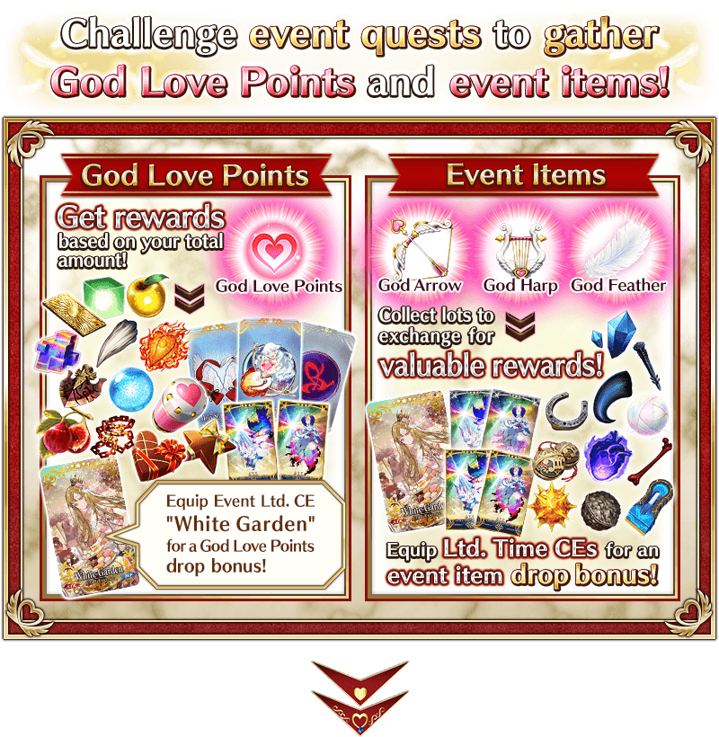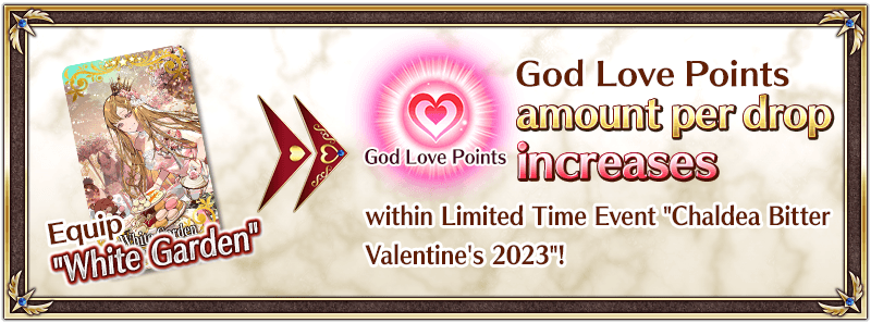 Equip the Event Limited Craft Essence "★5 (SSR) White Garden", available through Event Item Exchange, to increase the amount of God Love Points per drop.