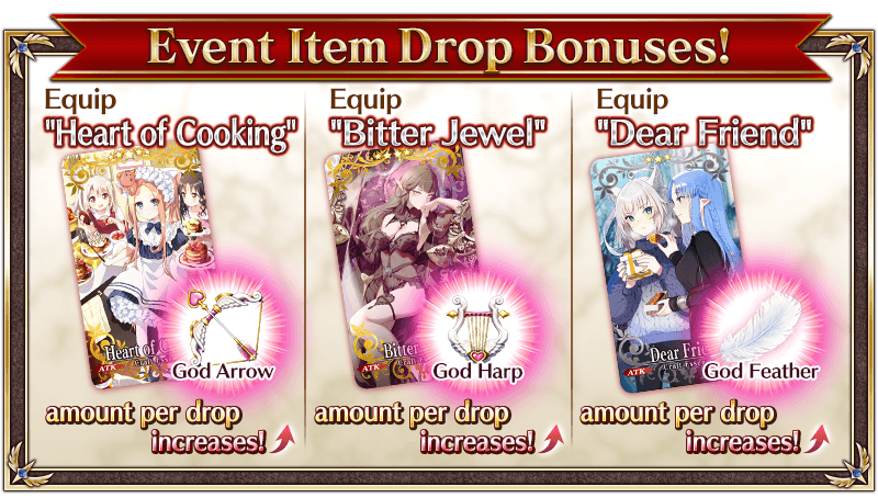 When you equip "★5 (SSR) Heart of Cooking", "★4 (SR) Bitter Jewel", and "★3 (R) Dear Friend", available through the ongoing Pickup Summons, you will gain a bonus to the amount per drop of event items "God Arrow", "God Harp", and "God Feather".