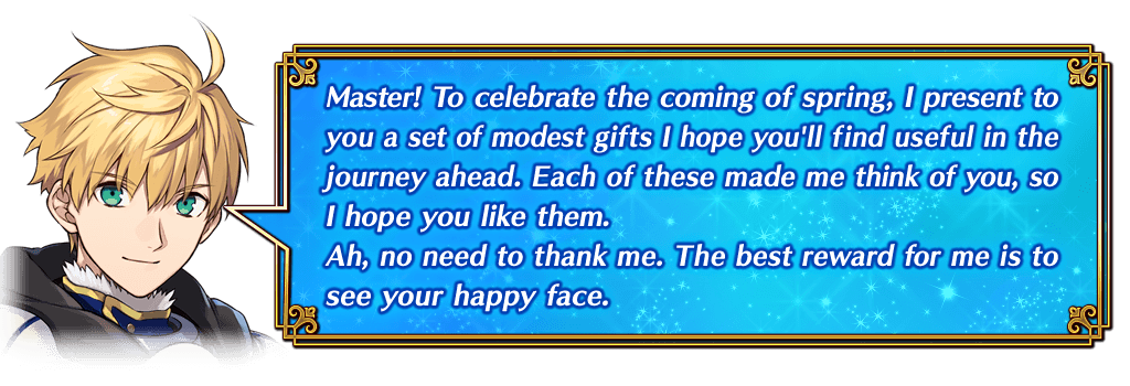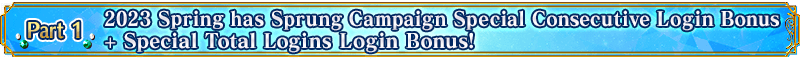 We'll be distributing special login bonuses to celebrate the 2023 Spring has Sprung Campaign. Log in for seven consecutive days during the campaign period to earn Silver Fruit x 10, Golden Fruit x 10, Blaze of Wisdom ALL ★4 (SR) x 10, 10,000,000 QP, Hero Crystal: Star Fou ALL ★3 (HP) x 10, Hero Crystal: Sun Fou ALL ★3 (ATK) x 10, and Summon Tickets x 10 (worth up to 11 Saint Quartz Summons)!