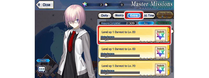 Servant Lv. missions will be displayed within the "Extra" tab on the Master Mission screen. Tap a mission marked "Can Be Claimed" to receive the reward.