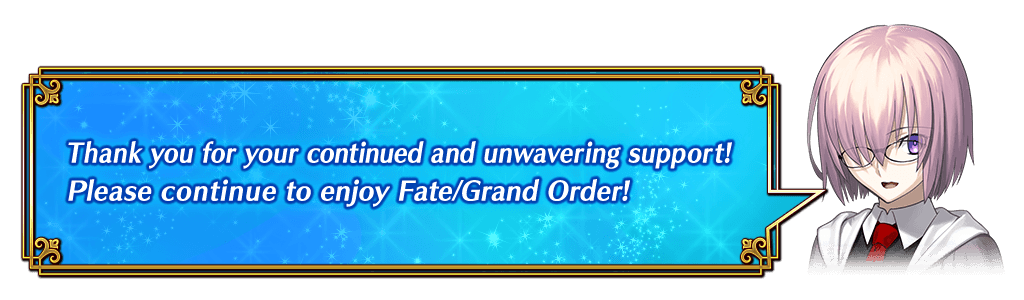 * Please note that Servant Skill Enhancement, Ascension (Servant Evolution), Bond Level Limit Release, Command Code Engraving, Command Card Enhancement, Servant Noble Phantasm Enhancement, Palingenesis, and Unlock Wardrobe will not be eligible for this campaign.