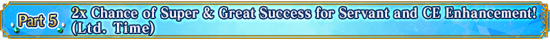 The chance of Super Success (double EXP acquired) and Great Success (triple EXP acquired) when performing Servant and Craft Essence Enhancement will be doubled for a limited time!