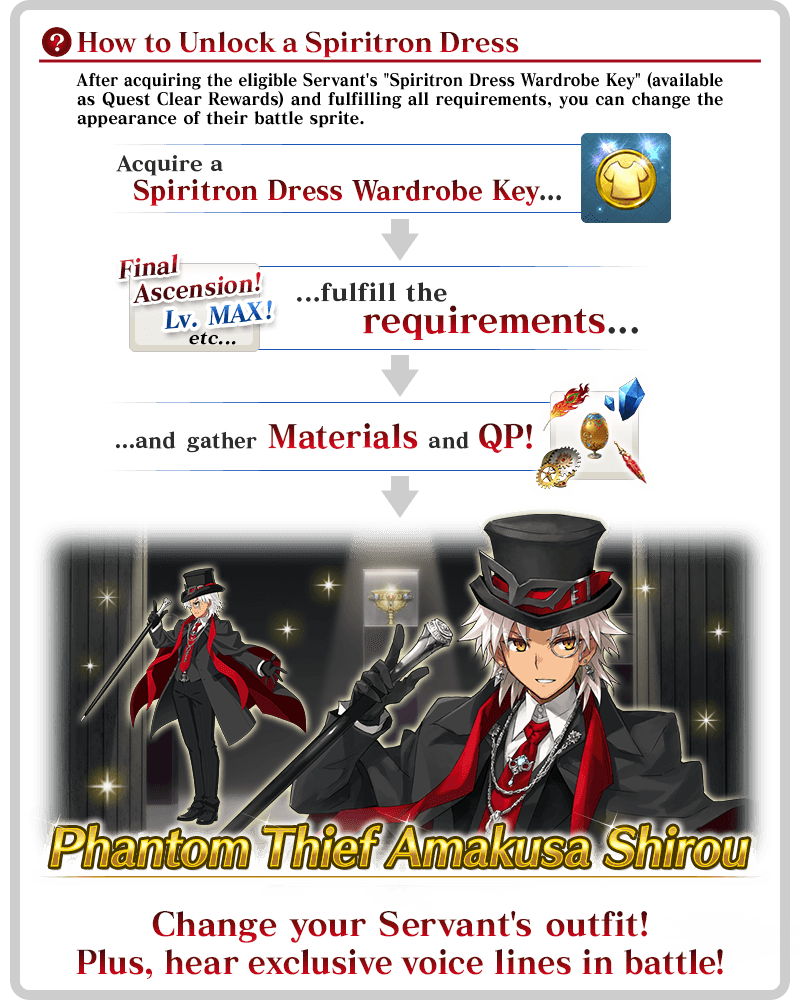* If you do not own "★5 (SSR) Amakusa Shirou", you can still acquire the Spiritron Dress Wardrobe Key, but it will not be usable.