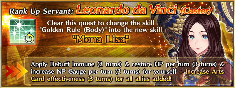 Special "Servant Rank Up Quests" will be added permanently to Chaldea Gate to strengthen "★5(SSR) Leonardo da Vinci (Caster)", "★5 (SSR) Amakusa Shirou" and "★3 (R) Jing Ke".