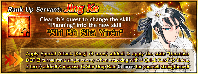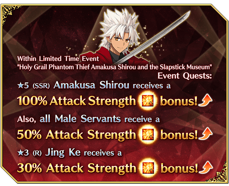 In addition, all male Servants aside from "★5 (SSR) Amakusa Shirou" will receive a "50% Attack Strength Bonus" for Event Quests, and "★3 (R) Jing Ke" will receive a "30% Attack Strength Bonus" for Event Quests!