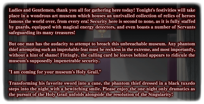 A Holy Grail has materialized and is on display in an art museum. The curtain rises on the Phantom Thief, sneaking past the tight security to steal the Holy Grail stored deep in the heart of the museum!