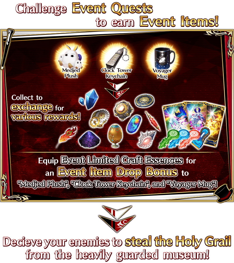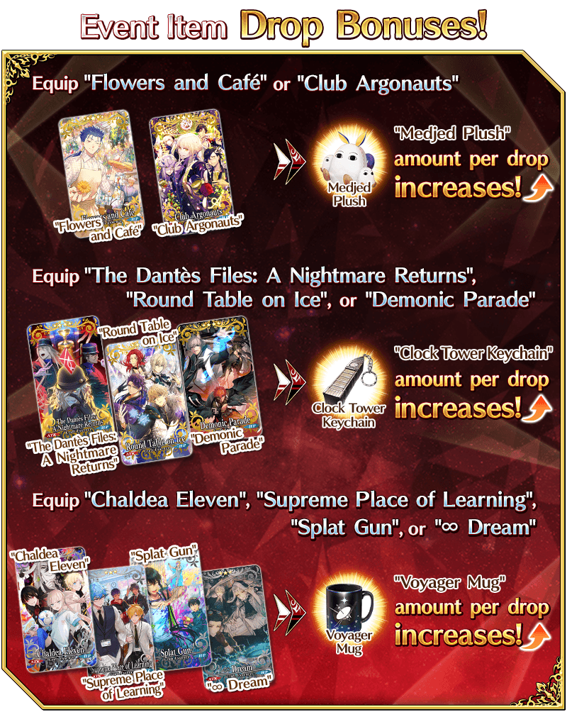 Equip Limited Time Craft Essences "★5 (SSR) Flowers and Café", "★5 (SSR) Club Argonauts", "★4 (SR) The Dantès Files: A Nightmare Returns", "★4 (SR) Round Table on Ice", "★4 (SR) Demonic Parade", "★3 (R) Chaldea Eleven", "★3 (R) Supreme Place of Learning", "★3 (R) Splat Gun" and "★3 (R) ∞ Dream", available in Saint Quartz Summon, to to receive a bonus to the amount per drop of event items "Medjed Plush", "Clock Tower Keychain" and "Voyager Mug".