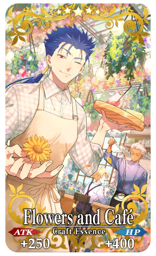 ★★★★★SSR Flowers and Café ATK 250 (MAX: 1000) HP 400 (MAX: 1600) Skill Increase C. Star Gather Rate by 400% & increase Quick Card effectiveness by 10% for yourself + Increase amount of Medjed Plush per drop by 1 [Event Only]