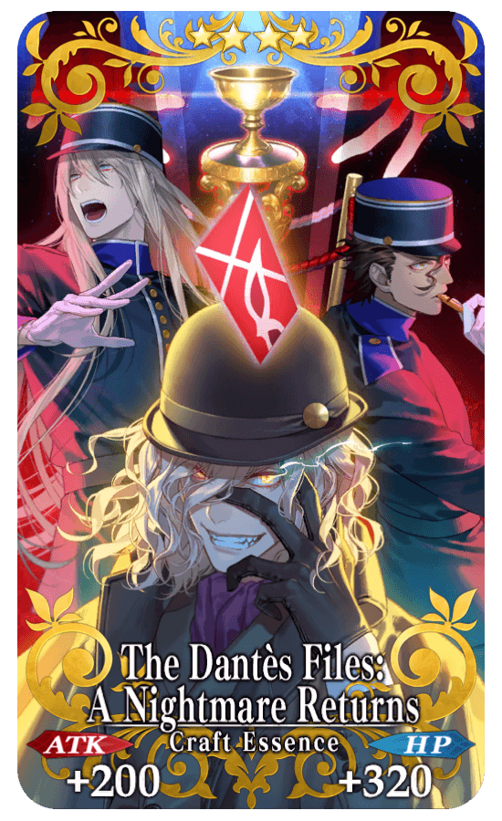 ★★★★SR The Dantès Files: A Nightmare Returns ATK 200 (MAX: 750) HP 320 (MAX: 1200) Skill Increase Quick Card effectiveness by 8% & increase NP Strength by 8% & NP Gain by 8% for yourself + Increase amount of Clock Tower Keychain per drop by 1 [Event Only]