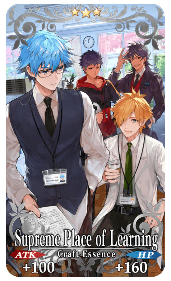 ★★★R Supreme Place of Learning ATK 100 (MAX: 500) HP 160 (MAX: 800) Skill Increase NP Gauge by 1% each turn & Arts Card effectiveness by 3% for yourself + Increase amount of Voyager Mug per drop by 1 [Event Only]