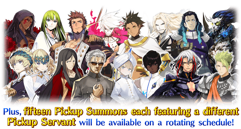 There will be 15 different rotating Summon Lineups, and including the featured Pickup Servant, only male Servants will be summonable from all 16 Pickup Summons!
