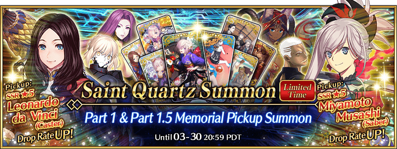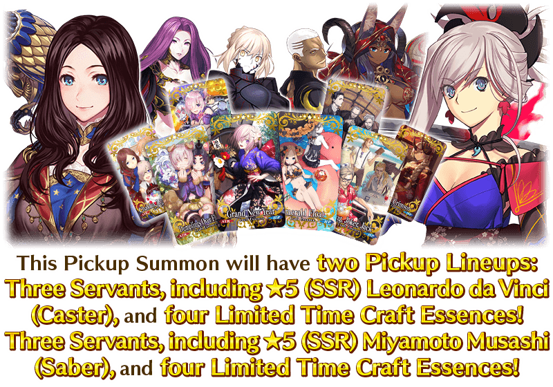 Six Servants, including Limited Time Servants "★5 (SSR) Leonardo da Vinci (Caster)" and "★5 (SSR) Miyamoto Musashi (Saber)", as well as eight Limited Time Craft Essences will be available for Pickup in two Pickup Lineups!